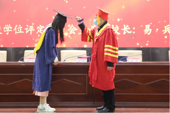 The ceremony commended the outstanding master's thesis instructors in Hunan Province level, the winners of outstanding master's thesis and their instructors, outstanding principal and the 2023 outstanding master's graduates. Yi Bing read out the decision on awarding the master's degree, and awarded the 2023 master's degree winners the degree certificate with the turning of tassel ceremony.