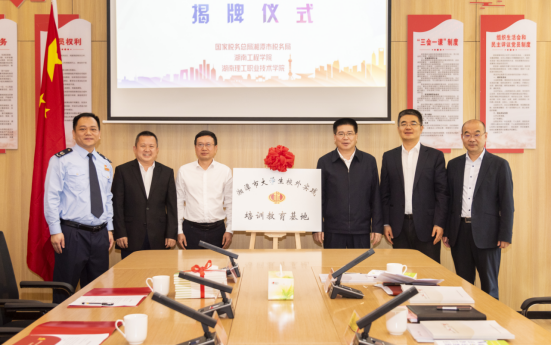 4月23日,湖南首个“大学生校外税务实践培训教育基地”在湘潭市“市民之家”办税服务厅亮相。国家税务总局湖南省税务局党委书记、局长曾光辉,国家税务总局税收宣传中心副主任任鹏飞,湘潭市委常委、市人民政府常务副市长刘新华,beat365官网党委委员、副院长罗毅平共同见证“湘潭市大学生校外税务实践培训教育基地”揭牌。