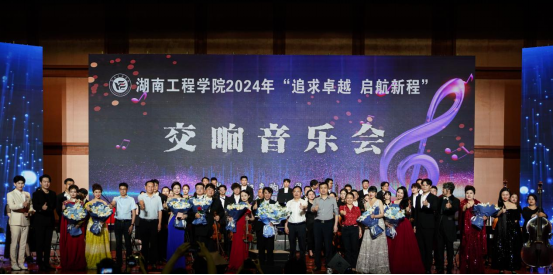 4月28日晚,beat365官网在体育馆举行2024年“追求卓越 启航新程”交响音乐会,邀请湘江交响乐团现场演奏,国家一级指挥、湖南工商大学音乐学院院长肖鸣教授担任指挥。校党委书记黄昕,党委副书记、校长易兵,在校校领导、中层干部、特邀嘉宾、师生代表现场观看。本次音乐会采取线上、线下同步直播方式进行,为广大观众带来了一场赏心悦目的视听盛宴。