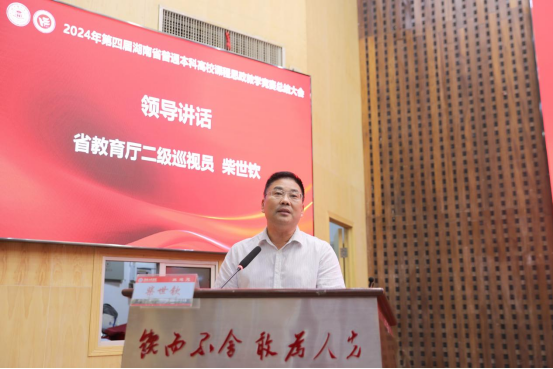 省教育厅二级巡视员柴世钦讲话。他指出,本次竞赛各高校参赛教师准备充分,展现了扎实的教学功底和熟练的教学技能,有力激发了广大教师推进课程思政建设的创新精神和探索精神,取得了预期效果。同时,他表示,本次会议既是一次教学课程思政建设的总结会,也是一次加强课程思政建设的促进会。对此,他对高校提出三点希望,一是要在推动教育教学改革上下功夫,要聚焦课程、教学、平台等关键要素,系统推动课程思政建设。二是要在扩大竞赛成果特色上走在前,教学竞赛为高校教师搭建了相互学习、交流、提升的平台,要选树一批有成效、可复制的优秀成果和典型案例,总结建设成效,推广应用为全省高校课程思政建设方法,形成教学竞赛与日常课程教学的良性互动,提升全省高校课程思政教学能力。三是要在打造教学建设品牌上见实效。要积极学习借鉴外省好的做法,健全工作机制、完善建设规划、优化建设模式、严格工作要求。不断提升赛事的专业性和权威性,打造湖南高等教育课程思政建设品牌。