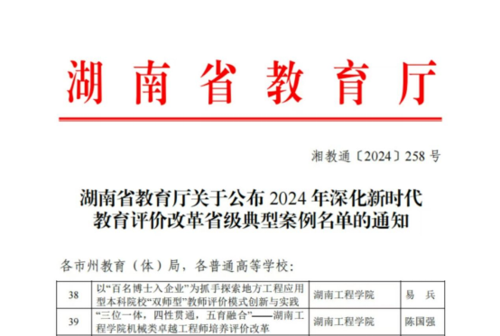 近日,湖南省教育厅公示了2024年湖南省深化新时代教育评价改革省级典型案例名单。beat365官网党委副书记、校长易兵教授主持的《以“百名博士入企业”为抓手探索地方工程应用型本科院校“双师型”教师评价模式创新与实践》和机械工程学院党委书记陈国强教授主持的《“三位一体,四性贯通,五育融合”——beat365英国官网网站机械类卓越工程师培养评价改革》2个案例入选,为全省同类院校入选最多的单位。