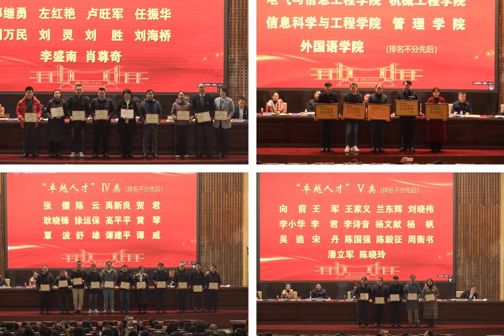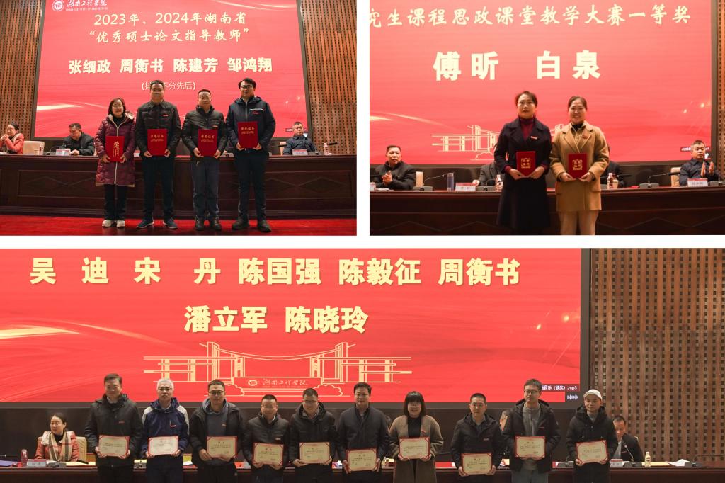 会上,与会校领导分别为beat365英国官网网站2024年度“卓越人才”聘任者、2023~2024年度科研工作先进集体与先进个人、第三届湖南省“优秀研究生导师和导师团队”、2023年湖南省研究生课程思政课堂教学大赛一等奖获得者等88人次颁发奖励证书。