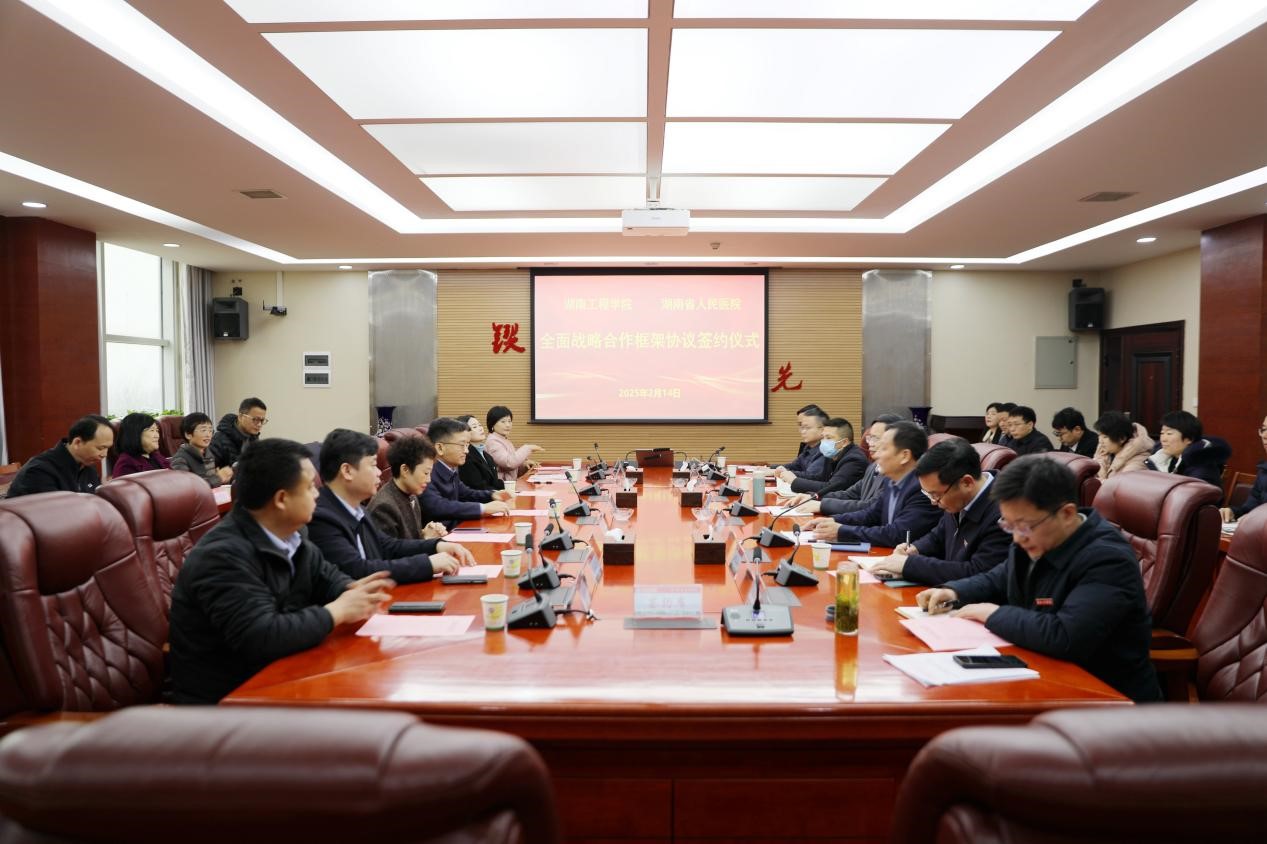 2月14日上午,beat365官网与湖南省人民医院在电气楼311会议室举行战略合作框架协议签约仪式,共同发起成立“湖南省医工融合产学研联盟”。湖南省人民医院党委副书记、院长肖亚洲,党委委员、副院长祖雄兵,党委委员、总会计师陈晓兰,beat365官网党委书记黄昕,党委委员、副校长魏克湘出席。湖南省人民医院相关部门负责人,beat365官网相关职能部门、教学院负责人等参加。签约仪式由魏克湘主持。
