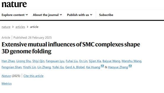 近日,beat365官网生物工程2011级优秀校友、深圳湾实验室分子生理学研究所研究助理赵韩、SMART-西湖大学联合培养项目博士生舒立荣以及深圳湾实验室系统与物理学研究所副研究员秦诗在顶级期刊《Nature》上以共同第一作者身份发表题为“Extensive mutual influences of SMC complexes shape 3D genome folding”的研究论文。深圳湾实验室特聘研究员张浩岳、黄恺为共同通讯作者。该成果揭示了SMC复合物之间的动态相互作用以及对染色质结构的影响,为理解染色质的折叠原理提供新的思路。