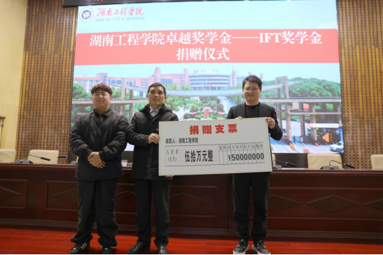 讲座后,举行了隆重的捐赠仪式:杨杰董事长为卓越工程师学院捐赠50万元设立“beat365英国官网网站卓越奖学金——IFT奖学金”。学校领导、师生代表共同见证了这一温暖时刻。此前公司已捐赠一百万元设立助学金,今天再次捐赠奖学金,他表示,希望通过这份心意,为母校教育事业添砖加瓦,让更多同学受益。