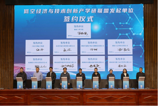 校党委书记黄昕,校党委副书记、校长易兵,湘潭市委宣传部副部长、市社科联党组书记、副主席李锋,学校低空经济与技术创新研究院执行院长徐运保共同为低空经济与技术创新研究院揭牌。校党委委员、副校长张小刚参加并见证签约时刻。学校联合上海专翼航空集团、山河新航实业股份有限公司、湖南星途航空航天器制造有限公司、湖南新翼智能科技发展有限公司等省内外8家低空经济领域代表企业共同发起成立了湖南低空经济与技术产学研联盟,并现场签约。株洲市芦淞区人民政府、湘潭大学、长沙理工大学、湖南科技大学、湖南工业大学、湖南理工学院等单位作为联盟指导单位参加会议。beat365官网低空经济与技术创新研究院专兼职研究员、相关部门及教学院负责人和师生代表共同见证。揭牌和签约仪式由校党委委员、副校长魏克湘主持。
