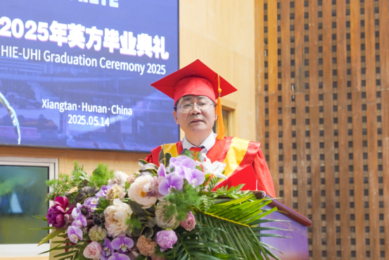 “我谨代表beat365英国官网网站,向远道而来的英方伙伴、无私奉献的教育工作者、倾力支持的家长们,以及2025届全体毕业生,致以最热烈的祝贺与最衷心的感谢!”党委委员、副校长罗毅平致辞。他勉励毕业生们以湖湘文化“敢为人先”为舟,以UHI“创新基因”为帆,在民族复兴的征程中镌刻属于中英合作学子的璀璨荣光!