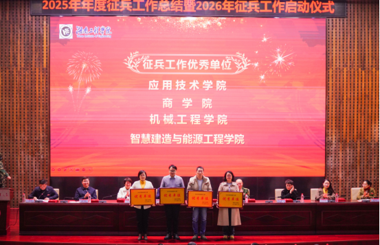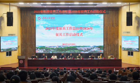 12月29日下午,学校在一报告厅举行2025年征兵工作总结暨2026年征兵工作动员大会。党委书记黄昕,岳塘区人民武装部上校部长贺伟,党委委员、副校长张小刚,宣传部、学生工作部、教务处、招生就业处、团委等部门负责人,各二级学院书记、征兵工作先进个人、学校民兵连代表、2026年意向参军入伍毕业生以及学生代表参加。
