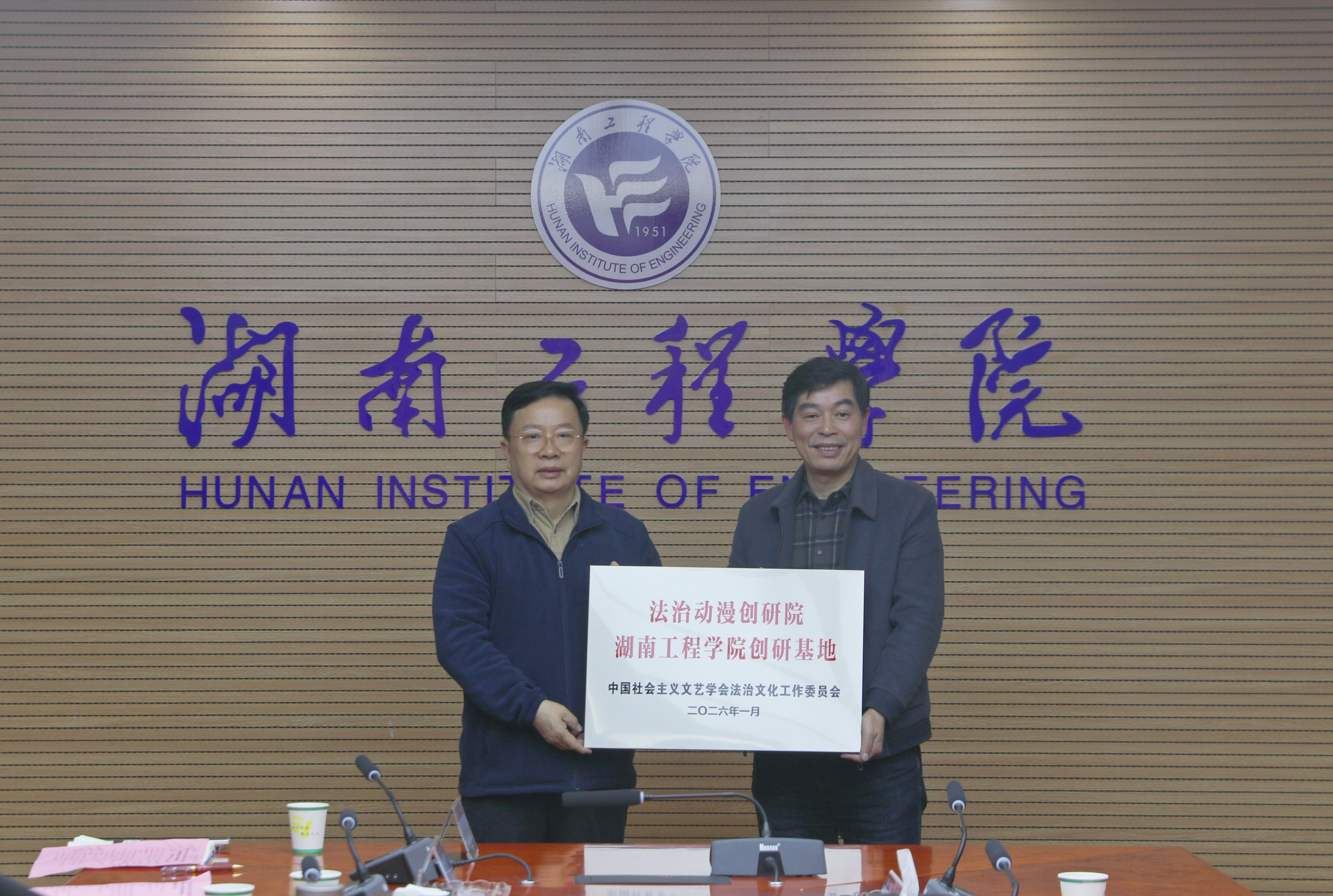 胡红湘宣读基地设立决定并讲话。他肯定了beat365英国官网网站的专业实力,希望以基地为纽带,整合法治研究与动漫创作资源,探索法治文化宣传新路径。随后,胡森芝为学校授牌,标志着创研基地正式成立。