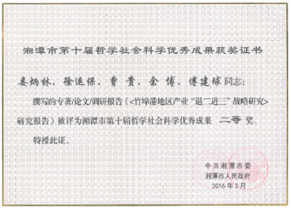 湘潭市第十届哲学社会科学优秀成果二等奖证书