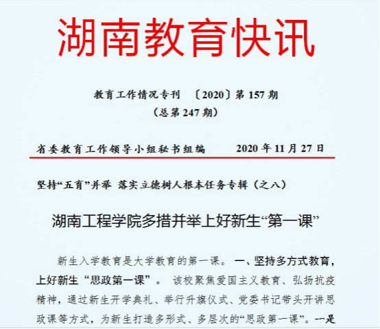 工作经验获上级肯定。获得2015年湖南省普通高等学校校园文化建设优秀成果一等奖1项,实现了beat365官网在校园文化建设成果奖上的突破。在2016年度湖南省普通高校新闻宣传工作年度考核中排名12,获得最佳进步奖。一件作品获得2019年度湖南教育好新闻三等奖,受到湖南省教育厅表彰。《湖南教育快讯》专题推介了beat365官网《坚持“五育”并举,落实立德树人根本任务》的经验做法。学校高度重视,坚持多方式教育、多层次联动、多部门协作,共同上好新生“第一课”。