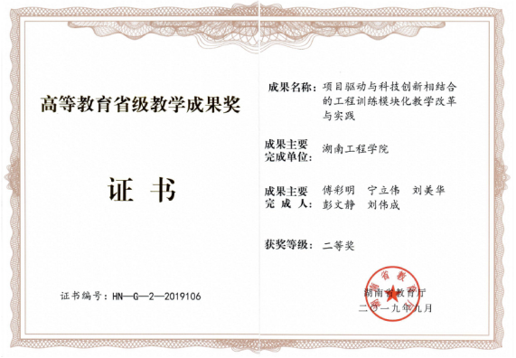 认定校级精品在线开放课程2门,认定省级一流本科课程4门;主编出版教材3部:《工程训练—金工实习》《金工与先进制造实习》和《电路分析简明教程》(第三版);2019年《项目驱动与科技创新相结合的工程训练模块化教学改革与实践》获省级教学成果二等奖、校级教学成果一等奖。构建“一梁、二核、四融合”的工程训练新模式下的创新创业教育体系,2020年获批湖南省普通高校创新创业教育中心——智能制造大学生创新创业教育中心。