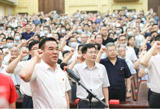 “我志愿加入中国共产党,拥护党的纲领,遵守党的章程,履行党员义务……为共产主义奋斗终身,随时准备为党和人民牺牲一切,永不叛党!”仪式上,全体党员举起右拳,面向党旗,在陈岳堂的带领下重温入党誓词。
