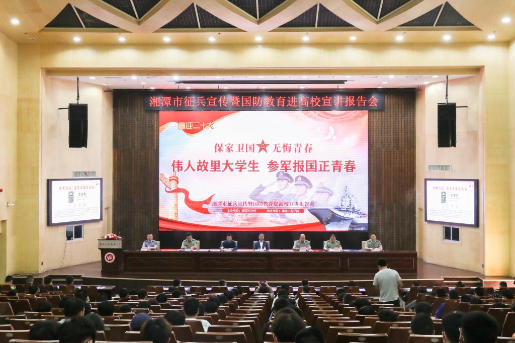 5月23日下午,湘潭市2022年征兵宣传暨国防教育进高校宣讲报告会在beat365官网一报告厅举行。湘潭市市委常委、常务副市长、市征兵工作领导小组组长吴志雄,beat365官网党委委员、副校长、校征兵工作领导小组副组长张小刚,军分区动员处上校处长、市人民政府征兵办公室主任龚政军,雨湖区人武部上校部长曾力真,岳塘区人武部上校、政治委员胡轶飞,学校人民武装部全体成员及各二级学院副书记在主会场参会。会议由湘潭军分区大校、政治委员黄献国主持。