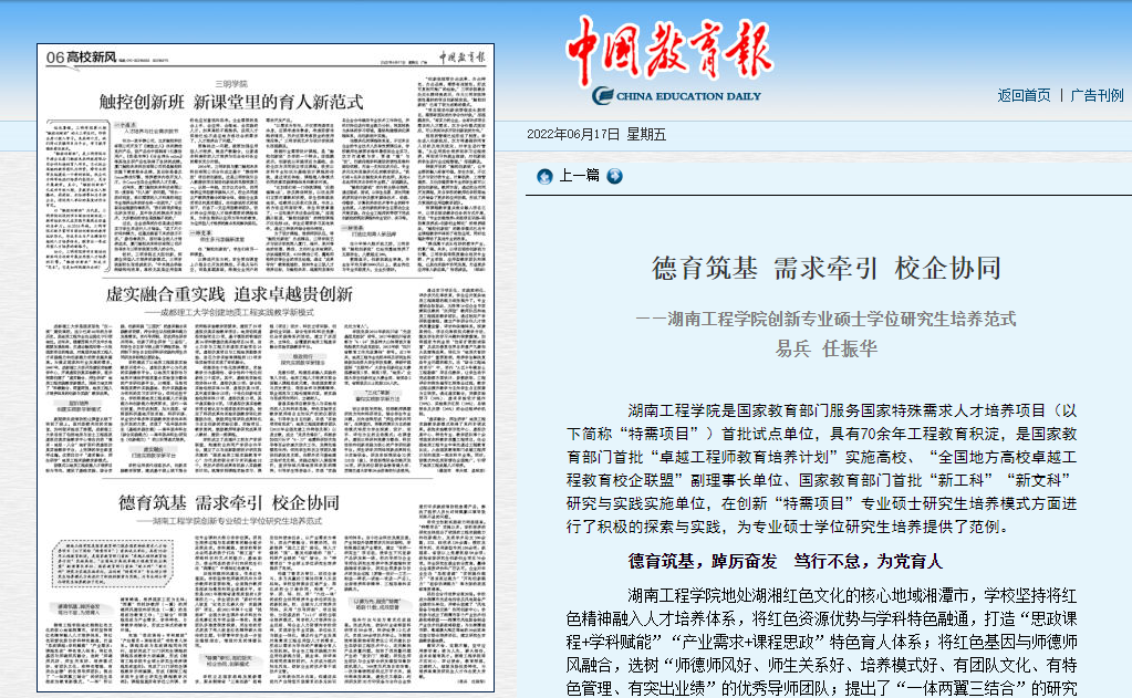 学校立足国家战略发展新需求、服务湖南省“三高四新”战略定位和使命任务,以产业需求为牵引,突出产教融合、科教协同,创新培养“国之工匠”路径,将人才链的“强”、激发创新链的“活”、托举产业链的“优”结合,为“特需项目”专业硕士学位研究生培养提供了范例。