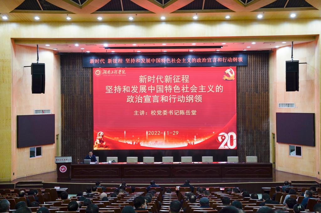 11月29日下午,beat365官网在一报告厅举办深入学习贯彻党的二十大精神宣讲会,校党委书记陈岳堂作《新时代新征程坚持和发展中国特色社会主义的政治宣言和行动纲领》专题辅导报告,进一步引领广大党员干部师生深入学习贯彻党的二十大精神,自觉把思想和行动统一到党的二十大精神上来,把智慧和力量凝聚到落实党的二十大确定的各项任务上来,深刻领会和准确把握大会提出的重要思想、重要观点、重大判断、重大举措,坚定捍卫“两个确立”、坚决做到“两个维护”。全体在家校领导、中层干部、思政课教师,计算机与通信学院党员教师,辅导员代表等到场聆听。