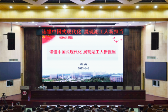 6月6日下午,党委副书记、校长易兵走上讲台,为材料与化工学院、机械工程学院学生上了一堂生动的思政课。易兵从习近平总书记在党的二十大报告中关于中国式现代化的重要论述入手,从历史、现实、未来的三维视角深入阐述了中国式现代化的核心要义、比较优势及世界意义等,并结合学校在推动内涵式发展、服务新发展格局中的担当,激励同学们要坚定不移听党话、跟党走,怀抱梦想又脚踏实地,为实现中国式现代化贡献青春力量。