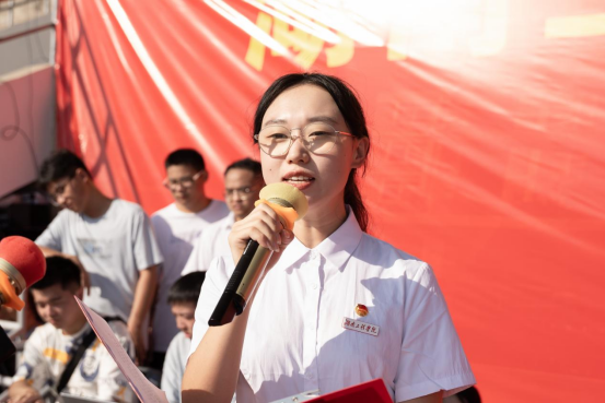 开学典礼仪式最后,校领导为新生代表佩戴校徽,全体新生在国旗下进行入学宣誓。现场师生一起合唱《我和我的祖国》,用真情唱响对党、对祖国的热爱和敬意。