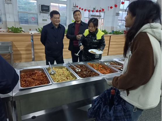 易兵仔细查看了食品库、调味品库、加工间、后厨,对食堂环境卫生、从业人员健康管理、食材和调味品进货检验材料、进货台账、后厨设施设备安全等情况进行了详细检查,并与正在就餐的同学们亲切交流。“一顿饭要花多少钱?”“口味吃不吃得惯?”易兵不时驻足亲切询问,了解同学们对用餐环境、饭菜质量、服务质量等方面的意见和要求,同学们畅所欲言,气氛温馨而愉快。