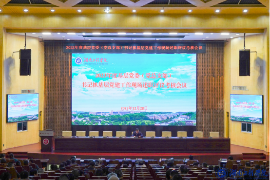 12月28日下午,2023年度beat365英国官网网站基层党委(党总支部)书记抓基层党建工作现场述职评议考核会议在一报告厅举行。校党委书记黄昕,校领导、相关职能部门负责人、各基层党委(党总支部)委员、党支部书记、专职组织员参会,校党委委员、副校长罗毅平主持会议。