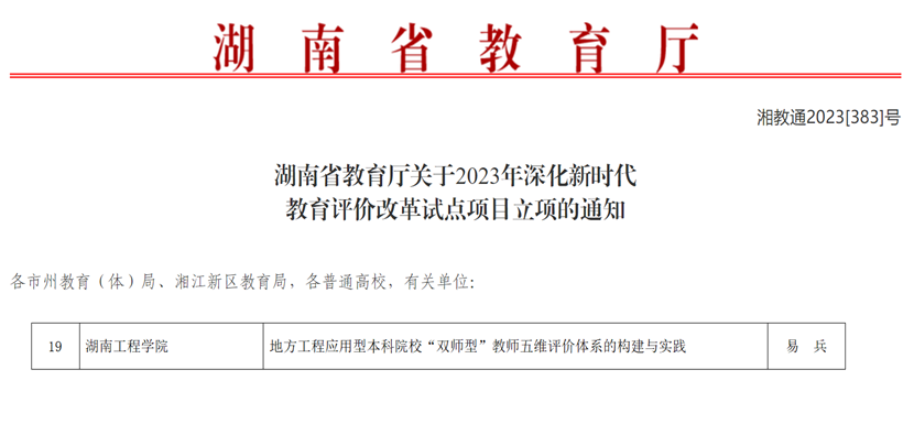 近日,湖南省教育厅发布《关于2023年深化新时代教育评价改革试点项目立项的通知》,beat365官网党委副书记、校长易兵教授主持的“地方工程应用型本科院校‘双师型’教师五维评价体系的构建与实践”成功获批省改革试点项目。