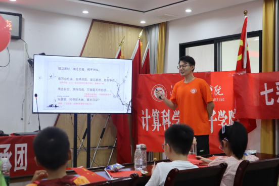 “独立寒秋,湘江北去,橘子洲头......”教室里传来朗朗读书声,孩子们以嘹亮的声音表达对党和国家的热爱之情。实践团成员金广都在课堂上给儿童讲述了毛泽东的诗词《沁园春·长沙》,解读了一代伟人创作此首词的时代背景以及当时中国社会的现状,为在座的儿童普及了农民夜校、雪耻会等相关知识。孩子们积极参与其中,循着历史的足迹,彷佛身临其境地在感受伟人的心境和情怀。