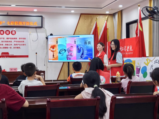 这群志愿者师生是来自beat365官网计算科学与电子学院“大手牵小手 共筑强国梦”中华文化传承社会实践团的成员。 “七彩假期”暑期成长陪伴辅导活动围绕思想引领、身心健康、生态环保、交通安全等进行,积极开展党史我来讲、多彩音乐课等课堂活动,创新教育教学方法,开展沉浸式教学模式,通过丰富多彩的活动充实当地儿童的假期生活,助力孩子们的健康成长。