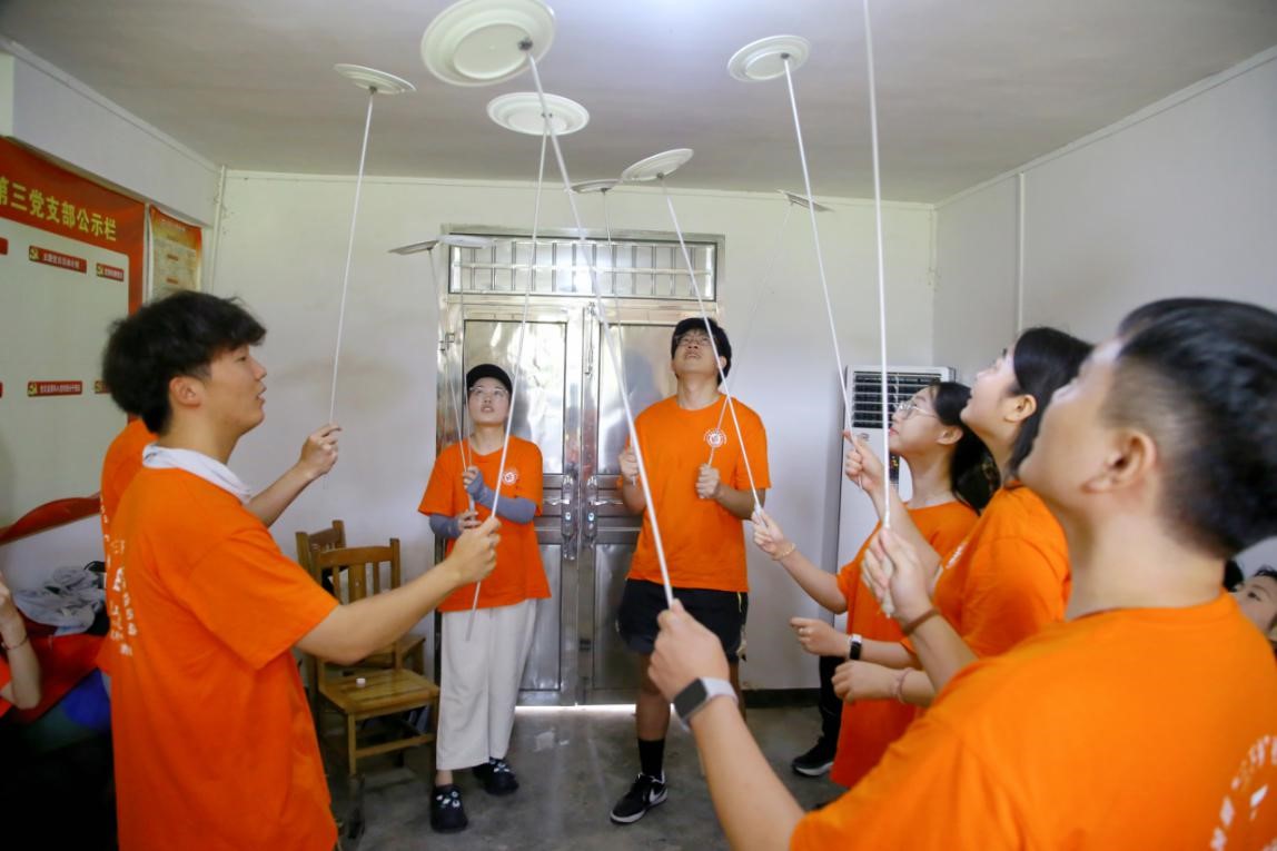 灰汤杂技传承人肖学东从历史渊源、基本内容、主要特征、重要价值、存续状况等五个方面详细介绍了灰汤杂技。并与师兄一同为实践团表演了口吐金龙、顶技、平衡术、称杆提米、花样转碟、眼皮提物等精彩的杂技。现场掌声不断、喝彩不断。随后,肖学东邀请宣讲团成员们亲身体验“转碟”表演,在他指导下,大家纷纷将手中数支碟片在空中转起,共同体验了一堂生动的非遗杂技课程。