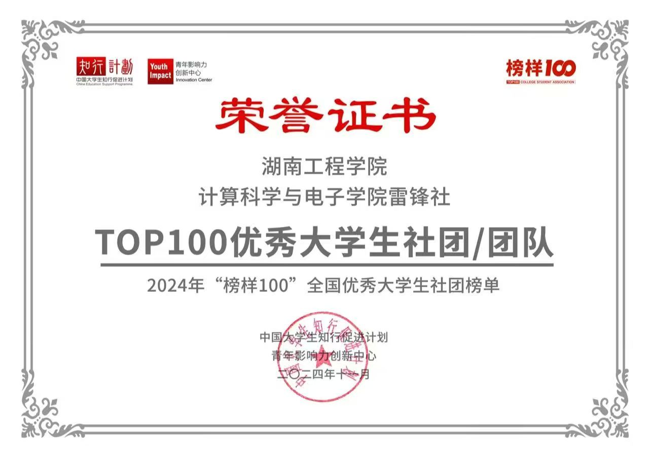 12月5日,由中国大学生知行促进计划和青年影响力创新中心联合发起的“榜样100全国优秀大学生社团及团队征集活动”获奖团队名单正式揭晓。beat365官网有十一个团队成功入围榜单,其中计算科学与电子学院的雷锋社志愿服务队凭借其卓越的贡献和出色的表现,荣获“榜样100全国优秀大学生团队称号。