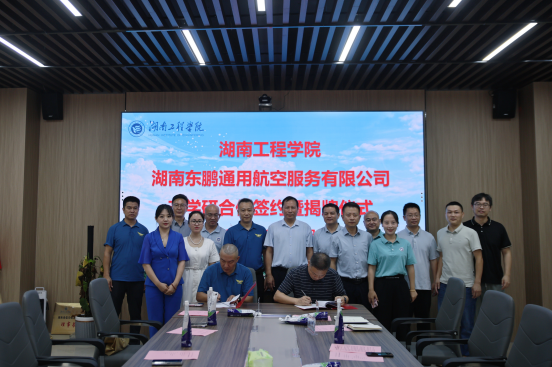 仪式上,商学院副院长潘立军与东鹏航空总经理张宁代表校企双方签署战略合作协议。商学院副院长曾贵、低空经济与技术创新研究院教师代表,湖南东鹏航空党支部书记曾志及相关部门负责人参加上述活动。