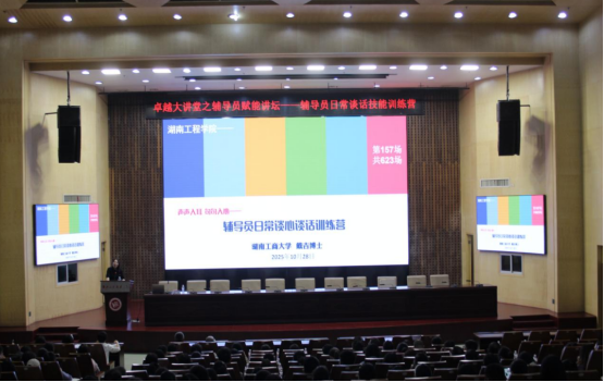 10月28日下午,湖南省高校优秀思想政治工作者名师工作室主题宣讲暨“卓越大讲堂”辅导员赋能讲坛在一报告厅举行。本次活动特邀中国心理学会注册督导师、湖南工商大学心理中心主任戴吉博士,为全校辅导员、班主任带来《辅导员日常谈话技能训练营》专题讲座。讲座由学生工作部部长刘琤主持。