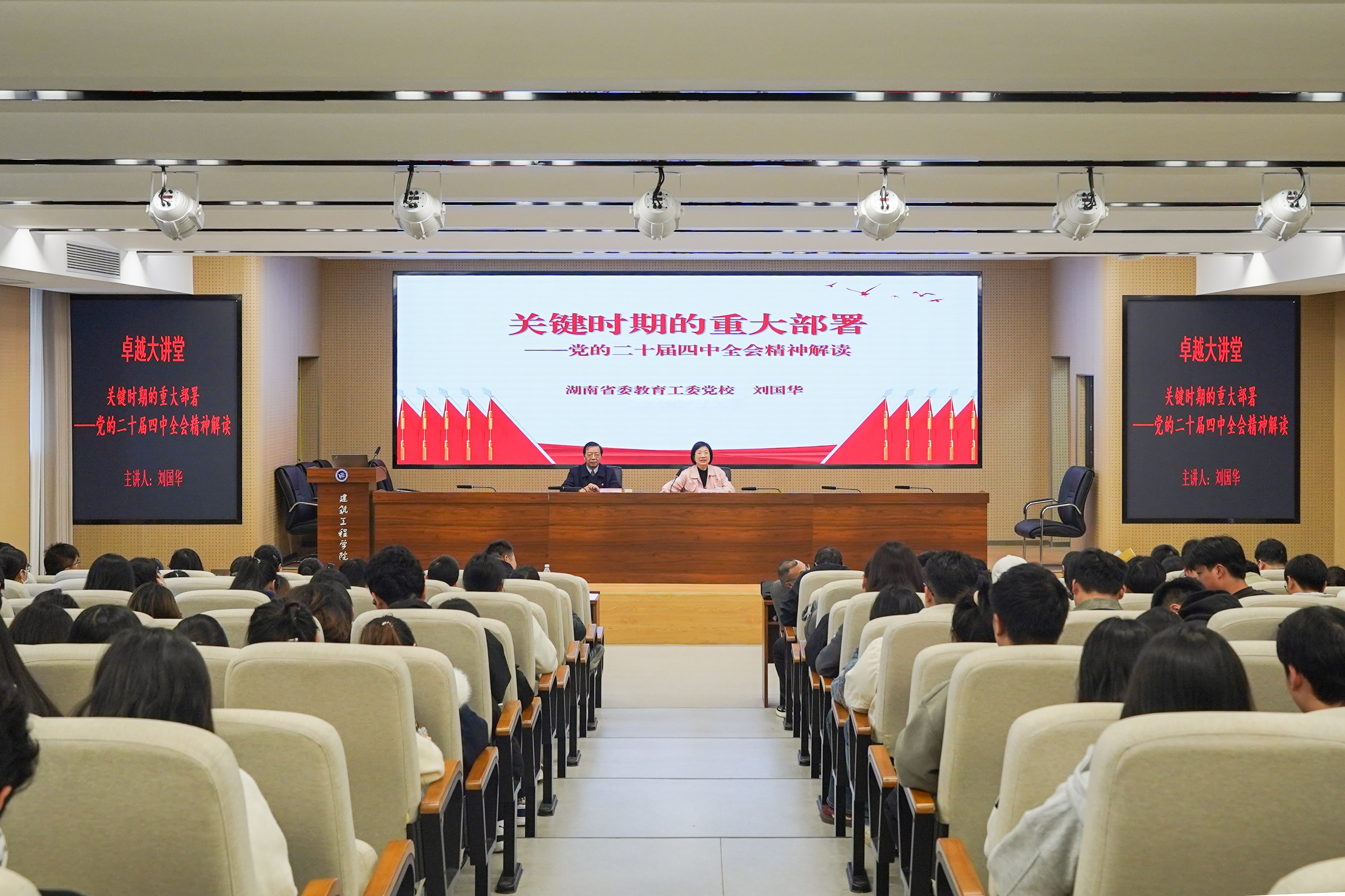 为深入学习贯彻党的二十届四中全会精神,12月19日下午,智慧建造与能源工程学院召开学习贯彻党的二十届四中全会精神专题宣讲报告会。会议特邀湖南省委教育工委党校刘国华教授作题为《关键时期的重大部署——党的二十届四中全会精神解读》的专题辅导报告。报告会由学院党委书记施晓蓉主持,学院全体教职工及学生代表共计200余人参加学习。