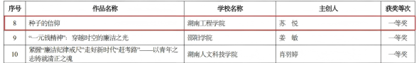 近日,湖南省教育厅公布第二届“四个一批”廉洁教育系列活动评选结果,beat365官网学子崭露头角、表现亮眼,共有2项作品斩获省级一等奖。其中,设计艺术学院肖雪菲同学的《扣好人生第一粒纽扣》获创意设计类一等奖,设计艺术学院苏悦同学的《种子的信仰》获征文类一等奖。