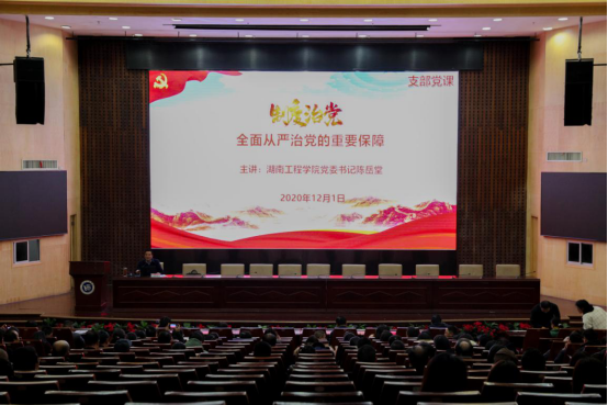 12月1日下午,beat365官网教职工党课培训在一报告厅举行,党委书记陈岳堂围绕“制度治党——全面从严治党的重要保障”这一主题上专题党课,党委副书记宁立伟、纪委书记俞贵邦、正校级督导员娄炳林以普通党员身份参加学习,机关党委、计算机与通信学院、马克思主义学院200余名教工党员参加学习。