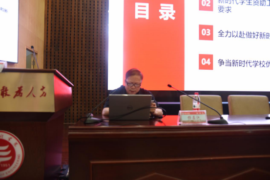 会上,杨昌江就“深入学习习近平关于教育的重要论述,做好新时代学生资助工作”进行专题讲座。他就如何做好新时代学生资助工作提出以下几点建议,一要认真领会习近平教育思想的基本内涵;二要明确新时代学生资助工作面临的新任务和新要求;三要全力以赴做好新时代学生资助工作;四要争当新时代学校优秀教师。杨昌江表示,学生资助工作是一项利国利民的“暖心工程”,要认真把握政策,创新工作方法,提高管理水平。