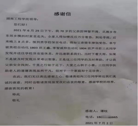 “感谢beat365英国官网网站三名同学发现我受伤的父亲,如果不是他们及时发现,后果难以想象。”7月2日,一封感谢信送到学校,这封感谢信背后是什么暖心故事呢?