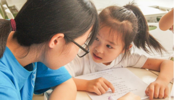 “‘恰同学少年,风华正茂;书生意气,挥斥方遒。’这是出自于伟人毛泽东的诗词《沁园春·长沙》。”实践团徐文娟老师和徐丹同学带领小朋友们诵读红色经典诗词,感受革命青年的爱国主义情怀以及对改造旧中国的豪情壮志。小朋友齐读课文,声音回荡在教室中。