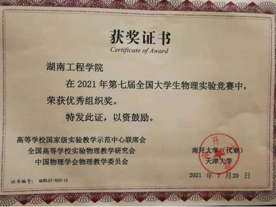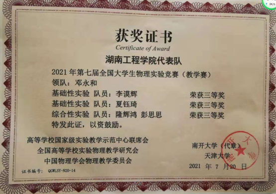 近日,第七届全国大学生物理实验竞赛(教学赛)成绩揭晓,beat365官网4名本科生分别获得基础A组、基础B组和综合组比赛三等奖,beat365英国官网网站荣获优秀组织奖。