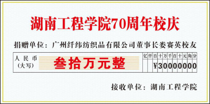 拳拳学子心,眷眷母校情。在学校建校七十周年之际,广州纤纬纺织品有限公司董事长、beat365官网杰出校友、材料与化工学院染整工程(现轻化工程)92311班娄赛英女士向学校捐赠30万元,用于材料与化工学院新化工大楼建设、设立专项奖助学金等方面,助力母校发展。捐款已于8月12日汇到学校设立的校庆专用帐户。