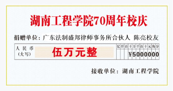 拳拳学子心,浓浓母校情。在母校建校七十周年之际,全国优秀律师事务所广东法制盛邦律师事务所高级合伙人、刑事业务部部长,纺织服装学院杰出校友92级陈亮(棉纺92011班)携其夫人周卓蓓(染整92051班),向母校发展规划项目纺织服装大楼专项捐赠伍万元,助力母校发展。