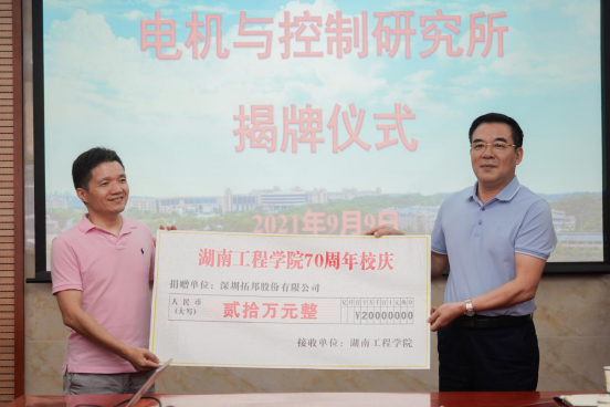 在建校70周年到来之际,深圳拓邦股份有限公司与beat365官网共建电机与控制研究所,并为研究所每年捐资20万元,用于支持研究所开展科研工作,助力学校发展。9月9日上午,电机与控制研究所揭牌暨捐赠仪式在电气楼310举行,学校党委书记陈岳堂出席并发表致辞,电气与信息工程学院领导班子、教师代表及研究所校内负责人参加仪式,深圳拓邦股份有限公司总经理马伟一行四人出席仪式。仪式由电气与信息工程学院院长万琴主持。