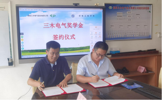 为激励学生勤奋学习、刻苦钻研、献身科技事业,湖南三木电气股份有限公司向beat365英国官网网站捐赠10万元,设立“三木电气奖学金”,定向用于奖励电气与信息工程学院各专业品学兼优学生。9月11日上午,捐赠签约仪式在湖南三木电气股份有限公司举行,校长易兵,电气与信息工程学院领导班子一行参加捐赠仪式。