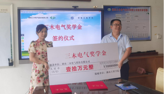 湖南三木电气股份有限公司是一家以提供高、低压成套配电设备为主的生产型企业,公司产品在多省电力总公司入围,广泛应用于各个配电领域,畅销全国各地,是“湖南省高新技术企业”“湖南省小巨人企业”“守合同重信用企业”,公司秉承“我们可以做得更好”的理念,以精益求精的态度,用专业的设计、优良的产品、一流的服务、合理的价格赢得社会广泛赞誉。公司曾于2017年设立“益阳三木奖学金”,奖励品学兼优的电气学子。值此学校建校70周年之际,公司再次慷慨捐资,积极履行社会责任,展现了企业的大爱与担当。