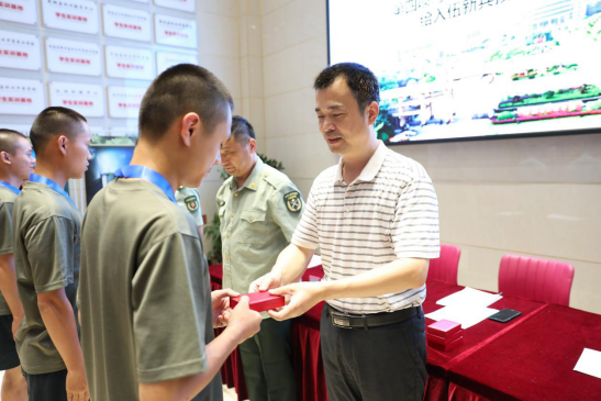 一枚承载着学校期盼的纪念章佩戴在每一位新兵的胸前,该纪念章以校徽为设计主体元素,饱含了全校师生对入伍新兵的深切情谊。