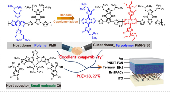 该工作通过将氯和烷基甲硅烷基取代的苯并二噻吩(BDT)单元插入到聚合物PM6中,构建了三元共聚物PM6-Si30,该三元共聚物表现出深的最高占据分子轨道,与PM6和BTP-eC9均有良好的混溶性,使其能够用作OSC的PM6:PM6-Si30:BTP-eC9本体异质结的第三组分。所得电池的最大光电转换效率 (PCE)为18.27%,达到国际先进水平。PM6:PM6-Si30:BTP-eC9电池的性能增强归因于改进的电荷传输、有利的分子排列、减少的能量损失和抑制双分子重组。这项工作证明了无规三元共聚物作为OSC中第三组分的潜力,并突出了构建具有改进光伏性能的三元系统的新策略。