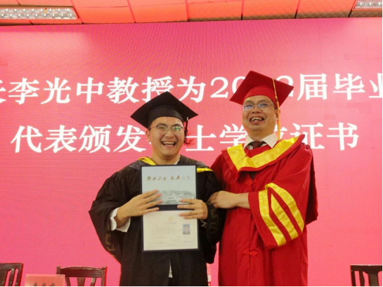 闵杰宣读《关于授予2022届毕业生学士学位的决定》,李光中为毕业生代表正冠,拨穗,授予学位证书。扶正流苏,比心拥抱,留影赠别,仪式现场庄重又温馨。四年辛勤付出终获回报,赤诚热血的初心照亮一名名刚直坚毅的毕业生。