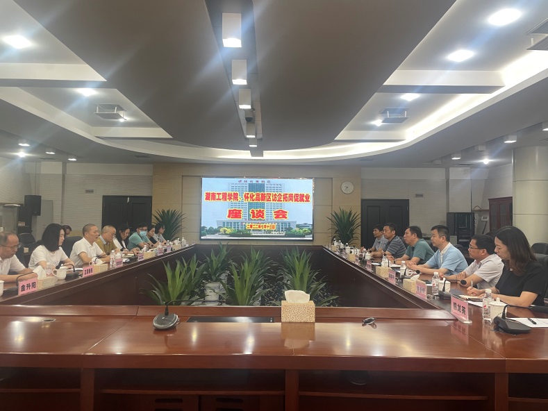 在交流座谈会上,怀化高新区工委委员、管委会副主任吕轶雄详细介绍了园区情况。怀化高新区前身为怀化工业园区,于2003年开园。2016年7月转型省级高新区,2018年2月升级为国家级高新区,总规划面积41.3平方公里,是武陵山片区唯一一家国家级高新区。“园区的发展离不开人才的引进,希望与学校加强合作交流,也希望更多的毕业生特别是怀化籍的毕业生选择怀化、选择高新区。”
