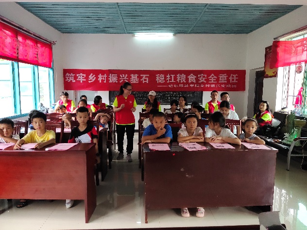志愿者们在此次实践活动中安排了“送教下乡”支教课环节,精心设计了“谁知盘中餐,粒粒皆辛苦”粮食安全知识宣传教育、心理健康知识教育、生命安全教育、创意绘画、军体拳、防范电信诈骗、“我爱我家”人居环境保护等多个课程,围绕国家政策、知识普及、艺术体验等主题维度,课程的趣味性很受孩子们的喜爱,志愿者们寓教于乐,融教于趣,化教于心,培养了孩子们的身心健康素质,提高了他们的学习自信心和胆量。志愿者们还给孩子们讲述了一代革命家粟裕大将顽强拼搏七战七捷的故事,让他们懂得幸福生活的来之不易,激发他们的爱国热情,为孩子们的心灵植入理想信念的种子,培养孩子们以革命前辈为榜样,勤奋努力学习,将来有能力和信心反哺家乡,助力乡村振兴。