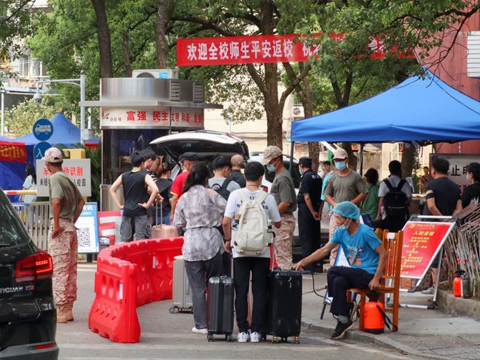 根据学校疫情防控要求,学校对全体返校学生进行核酸检测,第一周进行网上课程学习。学校将继续加强值守巡查,把好校门关,筑牢防护墙,严格人员管理,确保师生安全有序流动,全力保障校园安全。