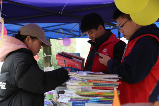 3月3日,beat365官网主校区至善路两侧蓝色帐篷前人头攒动,身着红马甲的“五彩湖工”志愿者正如火如荼的组织开展书香换“锋”情活动,同学们纷纷将自己闲置的书籍捐赠给“五彩湖工”志愿服务团,特别是考研上岸的同学,将自己的备考资料、复习笔记、重要习题集等都捐赠到帐篷内,并现场分享备考经验,让捐书活动成了同学们感情交流、兴趣探讨的重要平台。